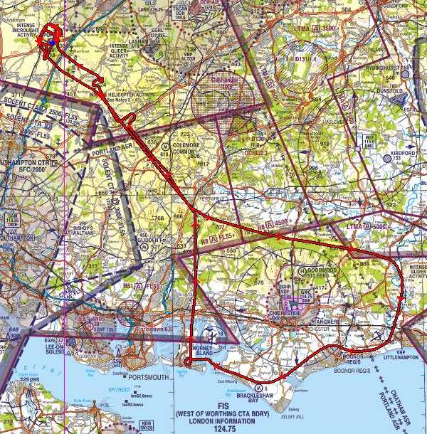I plan to go around Goodwood today (but not actually land there, because I haven't been down in this direction before. Well OK, yes I have done the leg down to the south of Petersfield many times, but then I head east along the ridge crest of the South Downs. The wind from the south reaching the downs makes this leg a bit unsettled and one moment your opening the throttle to stop sink, and the next you have it closed to stop climbing.