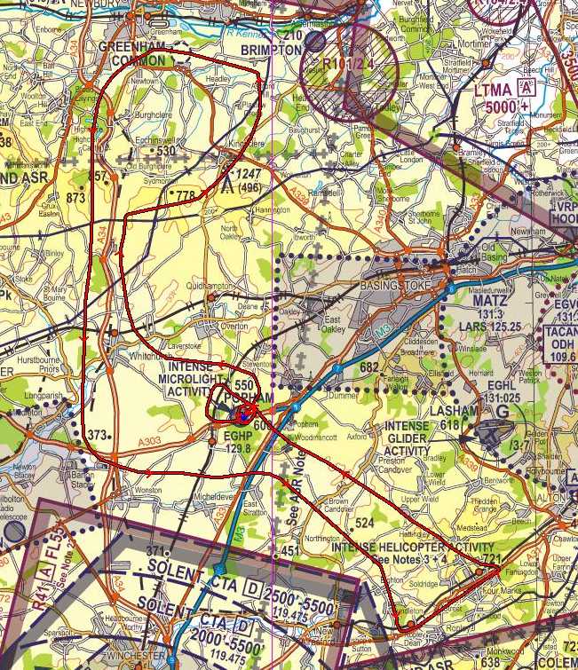 I was in luck, the plane was available early and still had 30 litres of fuel in it - enough for me today, as due to the weather I was only going for an hour. After checkout and warmup, I'm off on 03. I guess I'm not getting enough practice, because once again I'm totally impressed by the performance of the little planes. I head off toward Whitchurch and then follow the A34 north to Watership Down and follow the ridge to Hannington Mast. Then north again to have a look at Brimpton - I'm marginally tempted to call them for a landing there, but elect to go the other way to have a look over Greenham Common's broken up runways. Then south down the A34 (much faster with the wind) and over to Ropley Station. I follow the Watercress Line up to Four Marks. To the north there is a bank of rain, so I head back to Popham and try to beat it there. I join overhead and have a good landing.