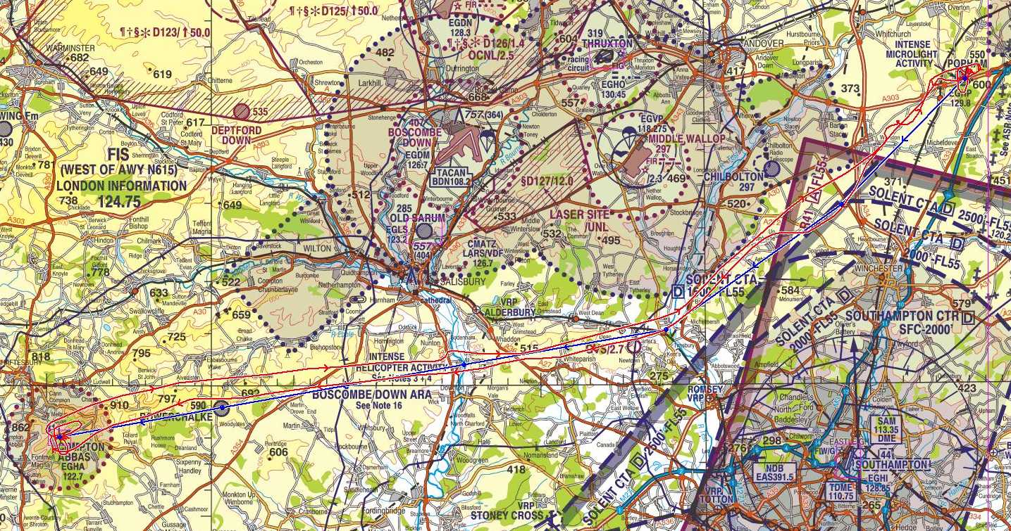 Take off from 26 and once again the vis is poor up to the inversion layer. It's also a bit bumpy. I keep fairly low whilst going past the Solent zone. It seems either the wind is stronger than forecast or in a slightly different direction as I have to adapt my heading to keep on course. Once past the Solent zone, I decide to climb above the inversion layer for a clearer view and once up there, it is perfectly smooth - great!
