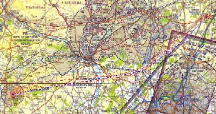 After a quick checkover, I'm on my way home to Popham. After take off, I turn back east and it appears that the smog has greatly reduced, but this impression may be helped by not flying into the sun anymore. I see a really interesting looking castle on a river bank and decide to have a better look. I turn north and start descending, but as I do, I see a flexwing that was following me, so I abandon this and continue my return.