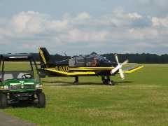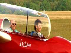 We turn final and I'm told to use the airbrake - too much at first, as we have to land long to finish up near the hanger. Quite a lot of rudder required to keep it straight and then back on the stick to round out, still we some airbrake, and then we touch-down. Whilst rumbling along, Merv announces that he has control, and points us toward the hanger and stops just before the tarmac. We then get out. I ask Merv how much of the landing he did, to which he replied nothing, until he said he had control. So it seems I landed it all on my own (of course whilst being told what to do). The airbrakes do make it easier.