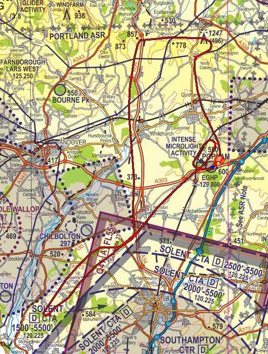 Eventually I'm off and the taxiways are quite muddy and slippery - I go carefully, attempting to keep to the greenest bits. Taking off on 03 I keep right on the left hand edge of the runway as the rest looks quite brown. I head north up to Hannington, then across to Highclere and then south along the A34. At Bullington Cross I head southwest towards Chilbolton for a bit of a refresher, then head back to Popham.