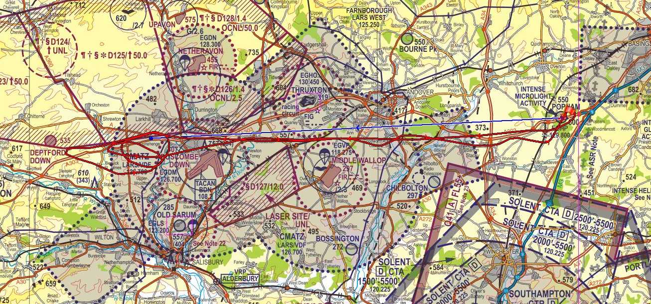 John Wilson is the first to land at Popham on 03 and warns that there seems to be a bit of a tailwind making landing long. Gerry reports the same. I make a fairly long final approach over the Black Wood - mindful that the low-wing EV-97 tends to float a lot, I knew that I needed to concentrate and come in precise. As it happens, I manage to get it down and vacated to the taxiway before Gerry comes past, although my braking is a little wobbly - must get some more practice with these toe-brakes.