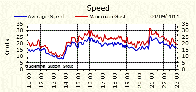 and it reports that the wind is 23 gusting 29 knots (see graph at 16:00). The