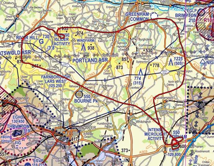 Too much procrastination - I really should get going. It's actually quite windy and a bit gusty. Once warmed-up, I take off from the intersection of 26. Hmmm it's a bit bumpy with the thermals too. I head north around Overton and then up to Greenham Common. Then heading west I decide to follow the ridgeline along as I know this area less well. Despite the bumpy conditions, I decide to give myself a PFL practice before getting to Rivar Hill. I find a field on top of the ridge that looks good and follow a constant-aspect approach round to what would have been a good landing and they climb away at an angle to avoid Rivar Hills gliding site. I then fly round this and now heading downwind I put the nose down a bit to see what groundspeed I can achieve (over 130 knots!) whilst heading back to Popham. A clean overhead join and landing.
