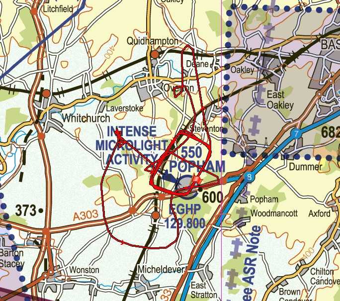 I was going to take G-RE, but both Eurostars have been put away and Chris says that there is plenty of fuel in G-DV so I get this one out. After a checkout, I take it straight to near the holding point for 03 for power checks etc. I was pretty sure the visibility is rubbish and as I take off it proves to be so. I continue climbing towards the north and get to the top of the inversion layer at about 3500' - here I can see around OK, but not so well downwards. At least I can still tell where I am, but to be on the safe side I don't want to go too far, so I turn back towards Popham. I do a few steep banked turns and then move on, then some more and whilst I so high and away from habitation, I do two complete revolutions on its ear.