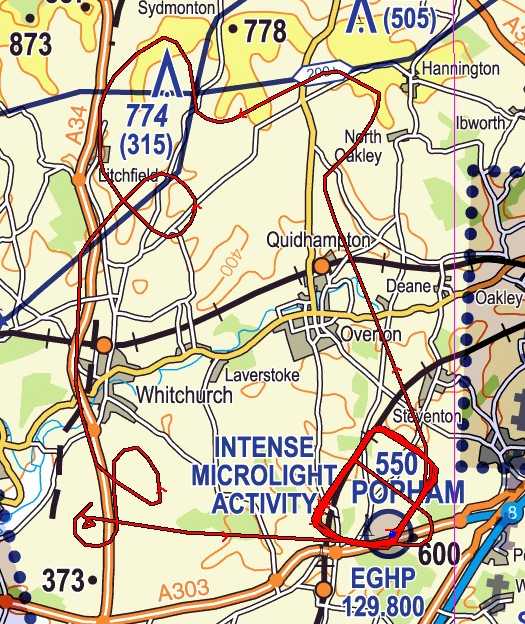 I take off from 03 and head north to Hannington Mast as I often do. However, before I get there I decide it is about time I did some practice forced landing (PFL) practice. Throttle closed, I select a suitable field that is north of the power lines. The approach is fine, although when I get lower, I find there is a little more upslope than I expected. But it all goes well and just before touchdown I hit the throttle and climb away. All good. Buoyed by this, whilst heading south I pull another one. This time, I find there is habitation too close to my target field - not a problem if it were a real emergency, but no need to upset the locals for a practice.