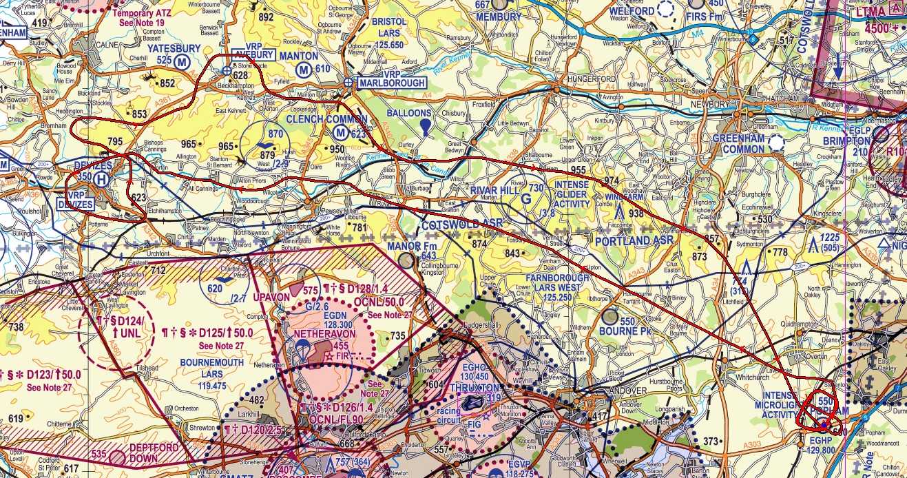 Up over the hill towards Avebury, then home via Savenake forest and along the escarpment to Highclere. An overhead join and a couple of extra circuits.