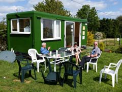 Passing to the east of the Benson MATZ, we head up past Aylesbury and three miles out, we give Holmbeck a call on SafetyCom and get a reply - not surprisingly they are using 29 which is pretty much into wind. We join overhead as Colin is already descending on the deadside. Avoiding the no-fly at the end of the runway, we turn downwind, then the slightly extended base round a farm for the "cranked" final approach (their description which made us laugh). There is a row of tall trees to the left that I have to avoid and a deep gully before the threshold. Fortunately, we have been warned about the steep upslope at the beginning of 29 and they are not kidding. All of us independently think about when we have been to Spence (Eastbatch Farm) with the steep upsloping runway. I pull back on the stick for a gentle touchdown just before the crest of the upslope hill. Colin has gone to the end of the runway ahead of me and obligingly was waiting for my arrival before backtracking, so I get to the parking a little before him.