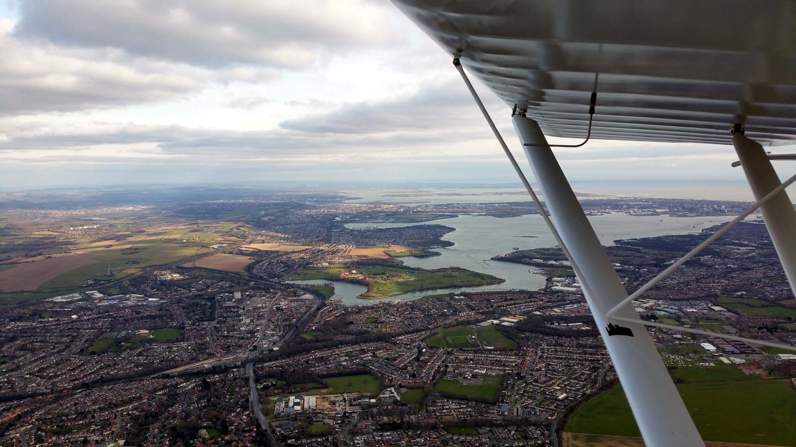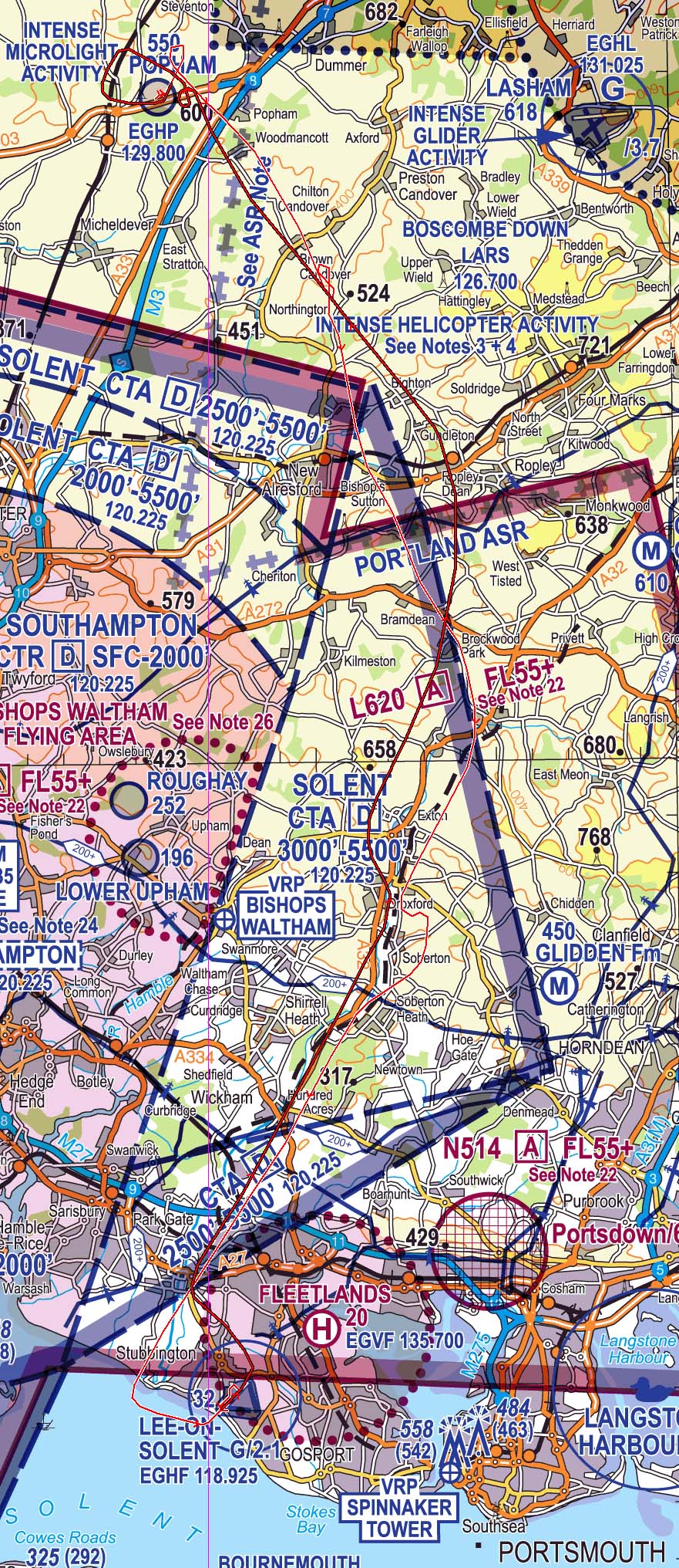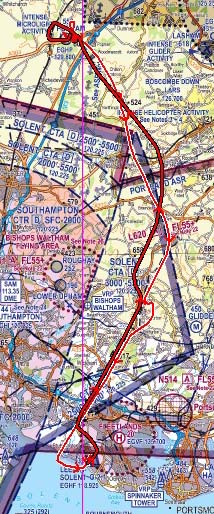 Ian has the outbound leg (good idea) and we take off on 03 and then head down to the south-east. This takes us on a more westly track than normal as we need to join downwind for Lee. With the wind, the groundspeed is really quick, so to stretch the flight out, we buzz around a bit and look at interesting ground features. We see three motocross tracks on route with bikes buzzing around them. When we get to the coast, Ian joins downwind and then turns base leg over the Solent. As we turn final we see a glider has turned final in front of us and instead of staying on the glider side and aiming for the grass strip (where they should be), they have come across to the power-circuit side and lined up for the hard runway - without any radio calls. They land on the hard before the displaced threshold, but fortunately they vacate quickly as we were about to go around - we are able to continue our landing.