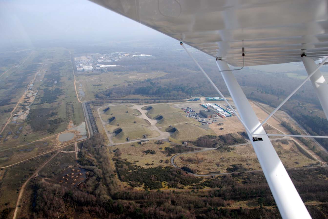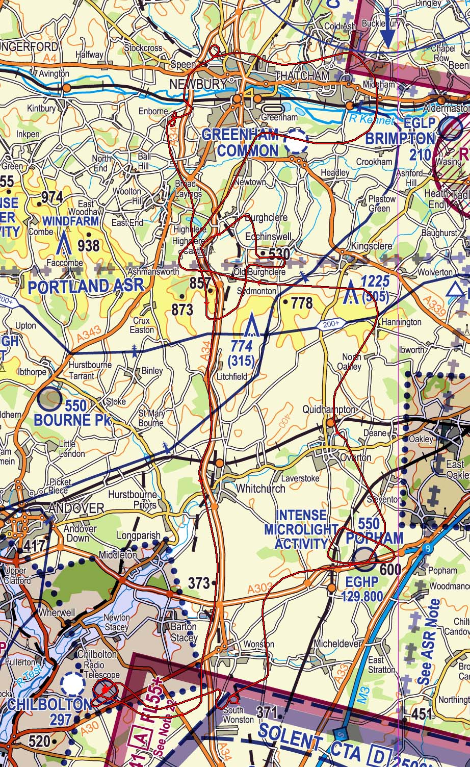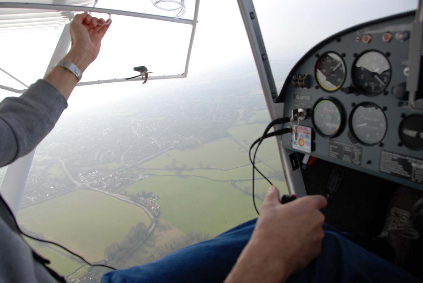 We head up to the north for some general handling and then round Hannington Mast we turn west along the escarpment past Watership Down. Then we drop down for a look at Highclere castle before going north for a pass along the defunct Greenham Common runway. Passing to the north of Thatcham, I demonstrate the party trick of slowing down and opening the door in flight, and Phil carefully tries it too.