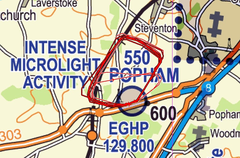 I take off (21) and enjoy a zoom-climb along 26. On the base leg I start my descent early as I want to try bringing her in low under power - it is also fun going low over the trees and then the approach over the field. On the second go round, whilst on base, we hear a call on the radio "Popham, this is Red Arrows". We reply to them to say that we are alone in the circuit (Popham Radio is long since shutdown). They inform us that they are passing to the south at 1000' past Alresford - we in turn say that we will keep in the circuit to the north. This approach goes a bit weird - I don't think I handled the transitions from powered approach, to glide and then back to power (in quick succession) for a low hop very well, so needed to go-around. As we climb out to the circuit, we can see them passing to the south and they obligingly put their smoke on briefly - an unexpected treat. Two more approaches (that are better) and then on the last go, I decide to have a go at a wheeler (for the first time). This is where you land on the main wheels a bit faster, with the tail still up, then use the elevator forward to keep the tail up for as long as possible. I realise that I don't really know at what speed I should actually put the wheels down. I have a minor bounce, but I can use the elevator to pin the mains down and then roll out pushing the stick forward until there is no energy left to keep it up - it then sinks down to a smooth touch. So the rest of it goes well, so not so bad for my first attempt. I probably ought to read the book again!