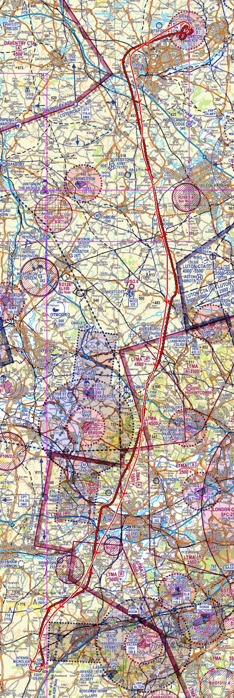 My turn for the outbound leg and we set off north, through the gap between Aldermaston and Burghfield and to the east of the Benson zone. Over the Dibley cutting, past Aylesbury and hen to the west of Northampton, to arrive at the airfield through the advertised approach corridor. The radio sounds quite busy, but once again appears to be handled calmly and efficiently. I join overhead and approach to land on 03R - they requested that we use the grass strip (alongside the concrete one) so that we can exit quicker.