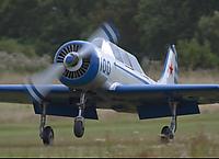 a Yak does a low pass along the runway. The Yak is an old Russian military trainer.